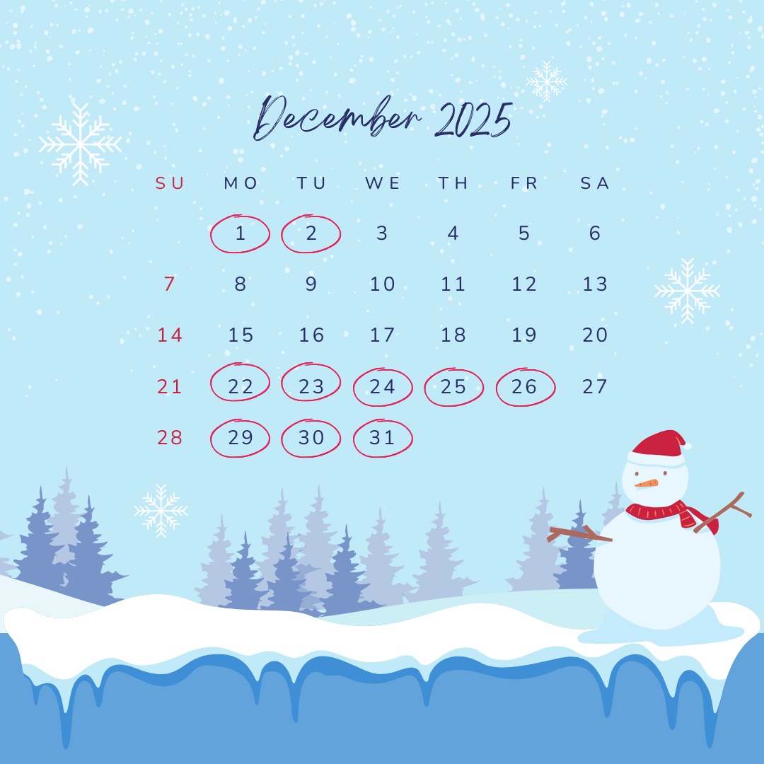 Welcome to December! Please take note of these important dates for the month:December 1-2: Fall Break - Thanksgiving HolidayDecember 22-31: Winter Break - Christmas HolidayLooking ahead: January 1 ...